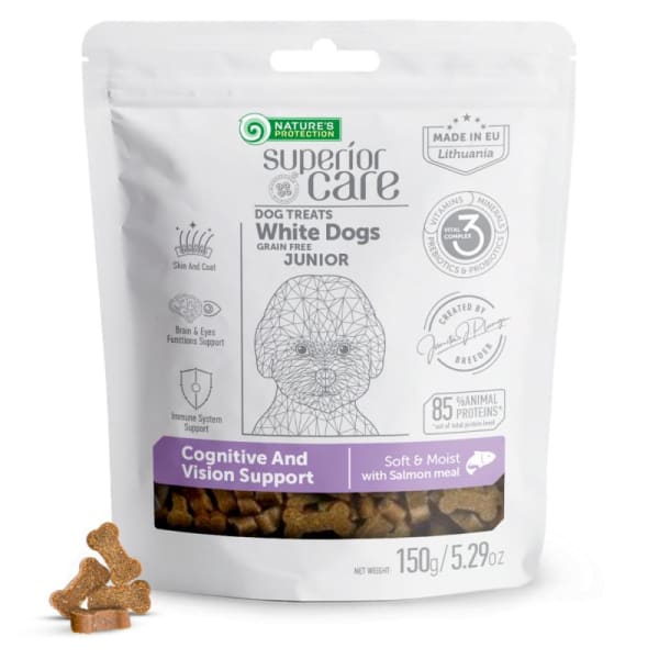 Complementary grain free feed - snacks for sensitive care with salmon for junior all breed dogs with white coat 5.29 Oz